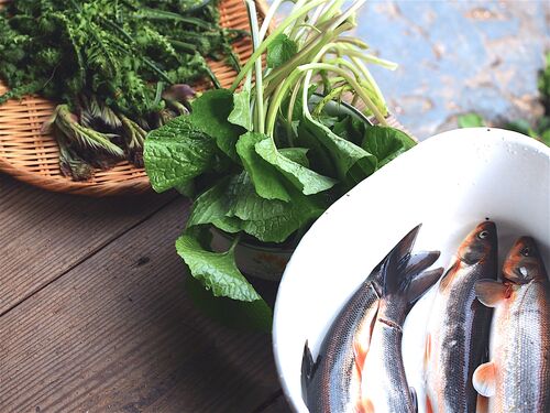 Loco lake fish and wild vegetables.タラの芽、コゴミ、ワサビ、ウグイ、近所でとれたの春の幸。